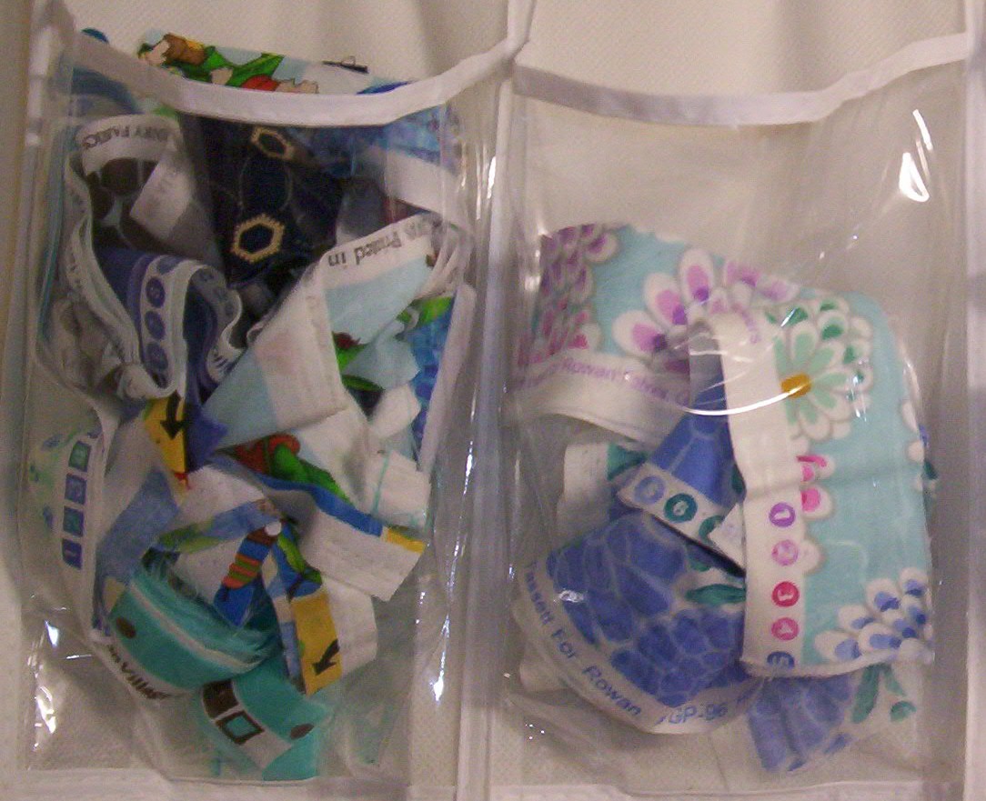 Originally, I came up with this system for sorting my scraps. It works well---but collecting selvages takes a considerable amount of time so I thought this would be best for a long-term selvage storage solution. Since I like the color of the fabric showing on my selvage projects, this method of organization is perfect for my purposes, dividing my pockets by color as I did initially with scraps.